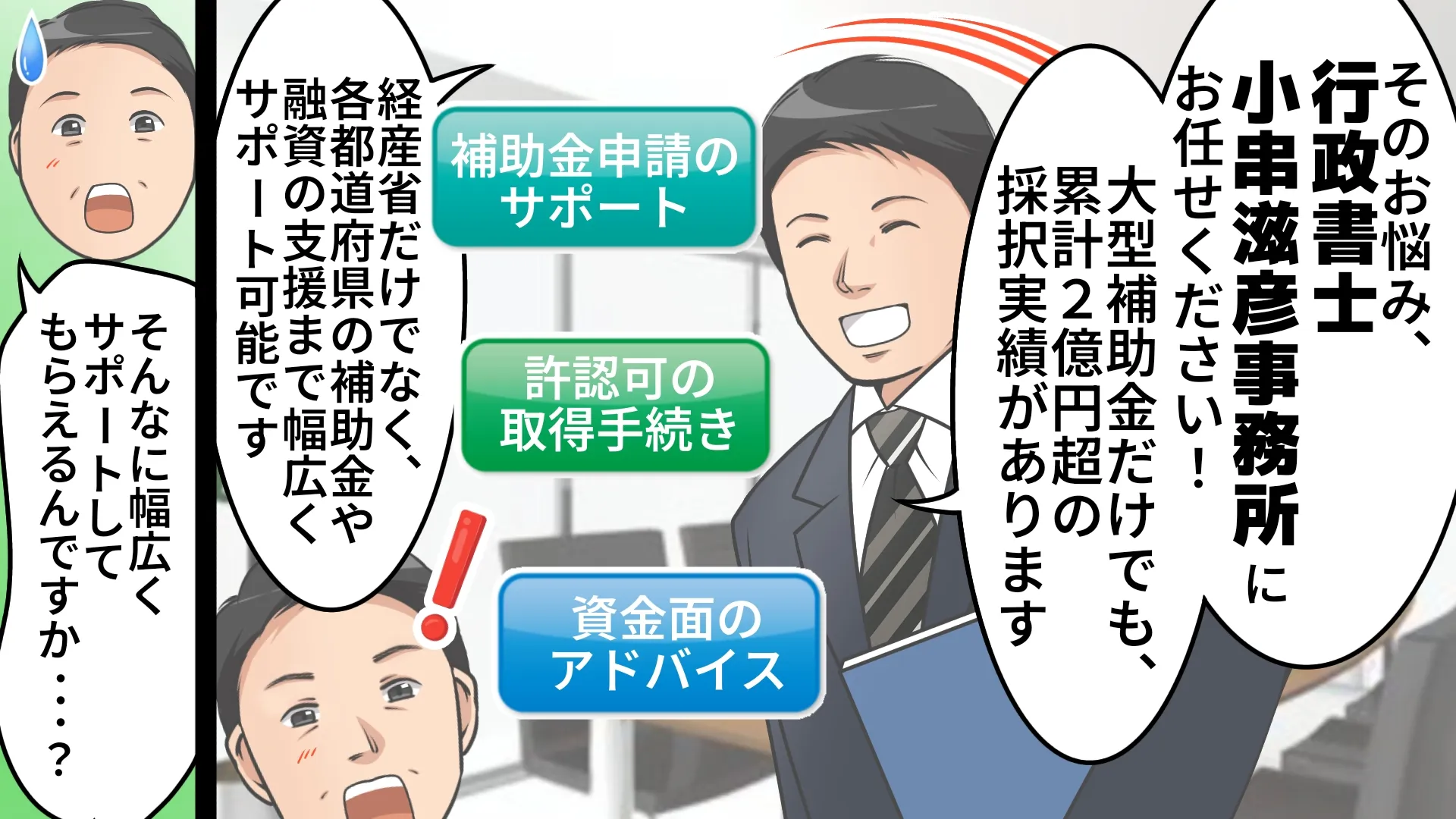 行政書士小串滋彦事務所では、補助金申請・許認可手続き・