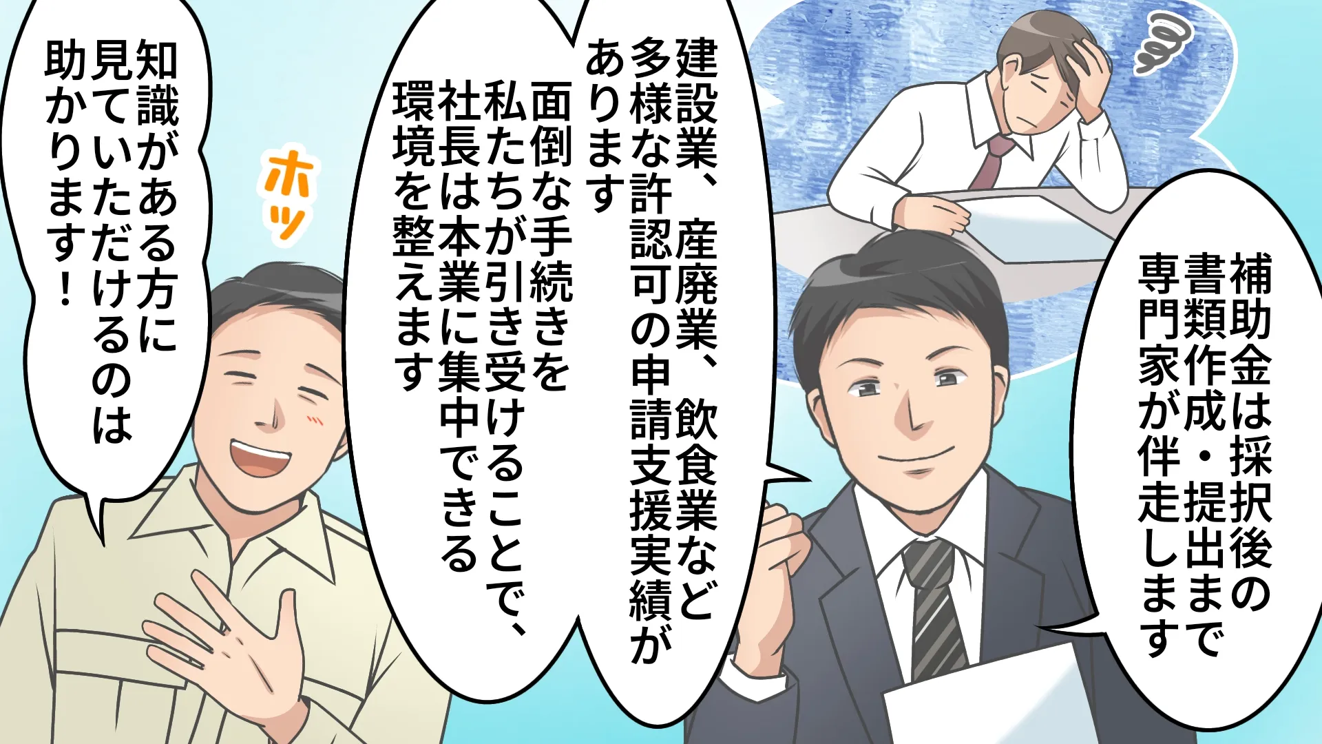補助金申請や許認可手続き、財務相談など、経験豊富なプロがスピーディーに手続きを進めます